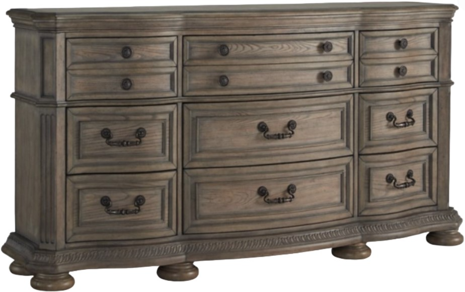 Merging traditional elegance with modern comfort, this dresser takes your bedroom retreat to the next level. Serpentine curves, ash swirl veneer inlays, and a glazed antiqued-look finish radiate timeless sophistication. Drawers of various sizes are packed with ample storage possibilities. Talk about stunning refinement.Read More