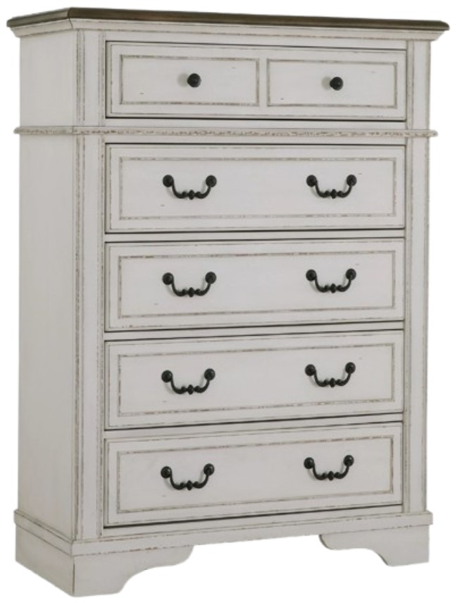 The Signature Design by Ashley® Blendon Brown/White Chest blends contemporary and casual styles with its two-tone matte white finish and replicated sugarberry wood grain pattern. Featuring white knobs, splay legs, and open shelving, it offers both charm and practical storage.Read More