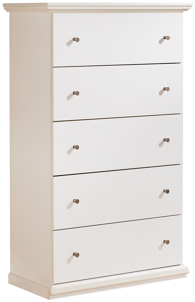 The Bostwick Shoals chest offers 5 smooth-gliding drawers, scalloped molding, and pewter-tone finished knobs.