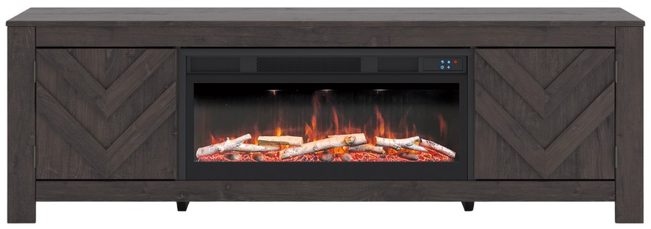 This TV stand with electric fireplace embraces a classically charming aesthetic and repurposes it for modern living. Its dark charcoal finish appeals to your love of vintage character, while a chic chevron pattern is effortlessly on trend. Media accessories stay tucked away in style thanks to hidden storage behind the doors.Read More